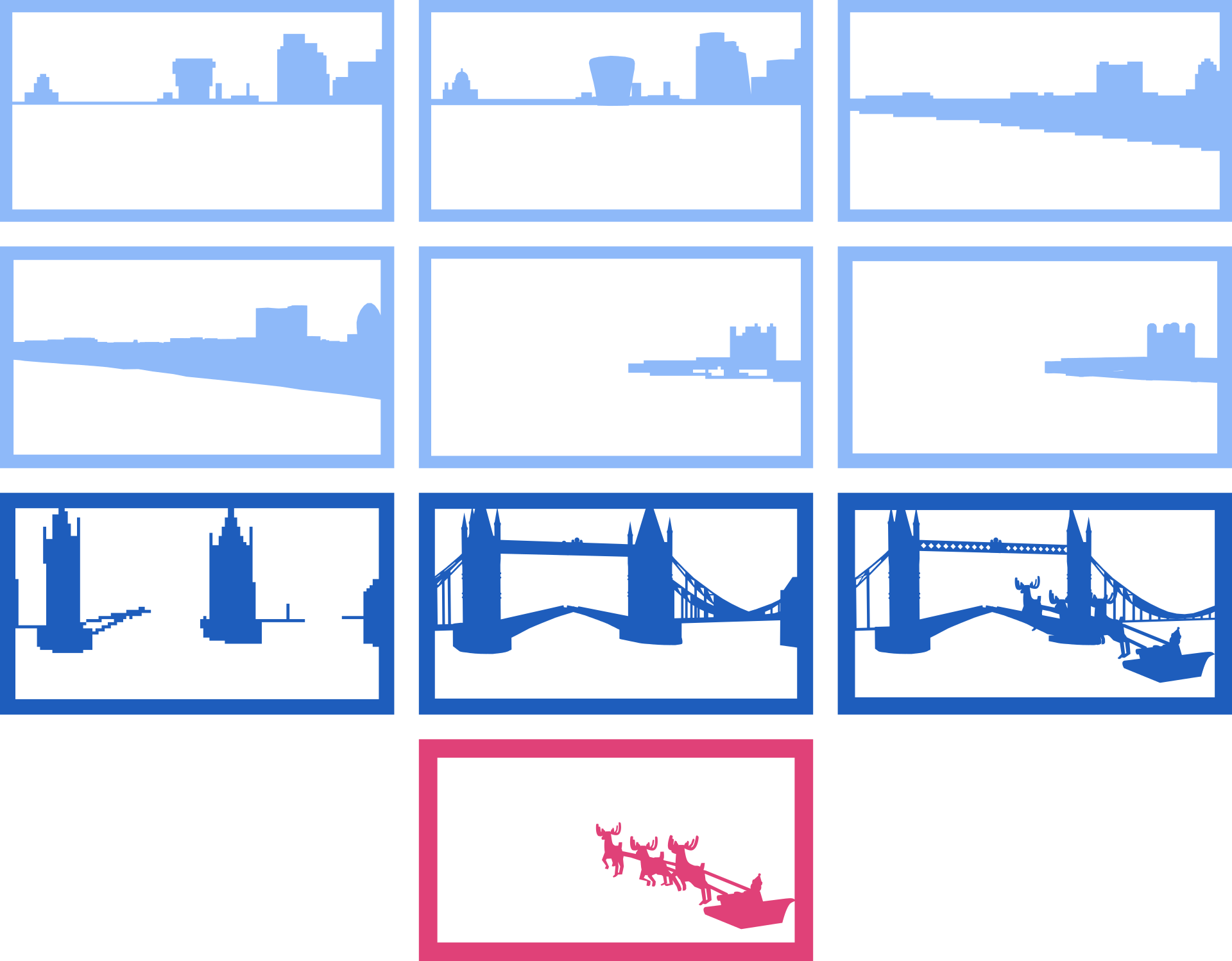 1 base white card layer; 6 layers of bright blue card for most of the City of London’s skyline, including St Paul’s, the Barbican, 22 Bishopsgate, the Walkie Talkie, the Gherkin, and the Tower of London; 3 dark blue layers for Tower Bridge; and 2 pieces of red card for the sleigh, reindeer, and frame.